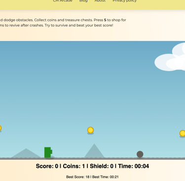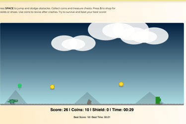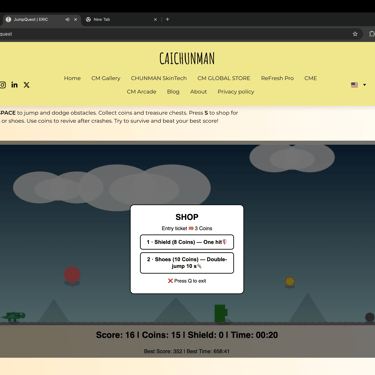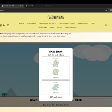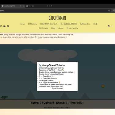 JumpQuest is CM Arcade’s inaugural action runner: a web-based dinosaur game that embraces the purity of a single primary action while refusing to accept shallow engagement as an inevitability. Our central question is modern and blunt: How can an intentionally simple, one-button experience sustain attention inside an over-stimulated, low-focus, reward-loop culture? Our answer is to layer clarity, micro-progression, strategic resource tension, and identity expression—carefully—so that depth emerges without cognitive overload. Every system working behind the scenes—state transitions, audio feedback, evolving speed curve, achievements grid, timed power skin, persistent storage—is chosen for one unifying purpose: lower the barrier to start, multiply the reasons to continue.