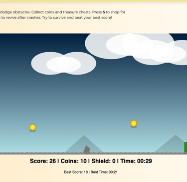 Around the central act of jumping we construct a resource economy that makes even small coin totals feel meaningful. A modest fee to enter the utility shop introduces an explicit cost to deliberation itself: you choose to strategize rather than being handed upgrades for free. Within that shop, each purchasable element—shield (error insurance), shoes (ten-second double-jump window), potential revive later (run continuation), and cosmetic skins (identity, not power)—embodies a different risk lens* (A2). The player must weigh immediate survivability against future contingency. This light, recurring triage carves micro-moments of strategic thought into what could otherwise dissolve into pure reflex.