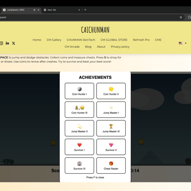 In synthesis, JumpQuest enforces a stringent rubric for every feature: it must clarify state, enhance agency, provide immediate and legible feedback, or deepen identity and long-term motivation. The core verb remains single and approachable; the emergent experience is layered and renewable. Reflex tension produces coins; coins foster strategic trade-offs; trade-offs fuel achievement pursuit; achievements unlock identity; identity reinforces replay; replay feeds mastery against a crafted escalation curve. Planned innovations—Mono Mode, enhanced achievements, reflective summaries—are refinements orbiting the same central loop of clarity → choice → feedback → identity. This is CM Arcade’s design DNA: iterate deliberately, keep the surface elegant, let depth emerge through systemic interplay, and invite motivated collaborators to build the next layer with us at arcade@caichunman.com. For players, the promise is straightforward: JumpQuest will respect your time, reward your learning, and evolve with you—beginning with a single jump.